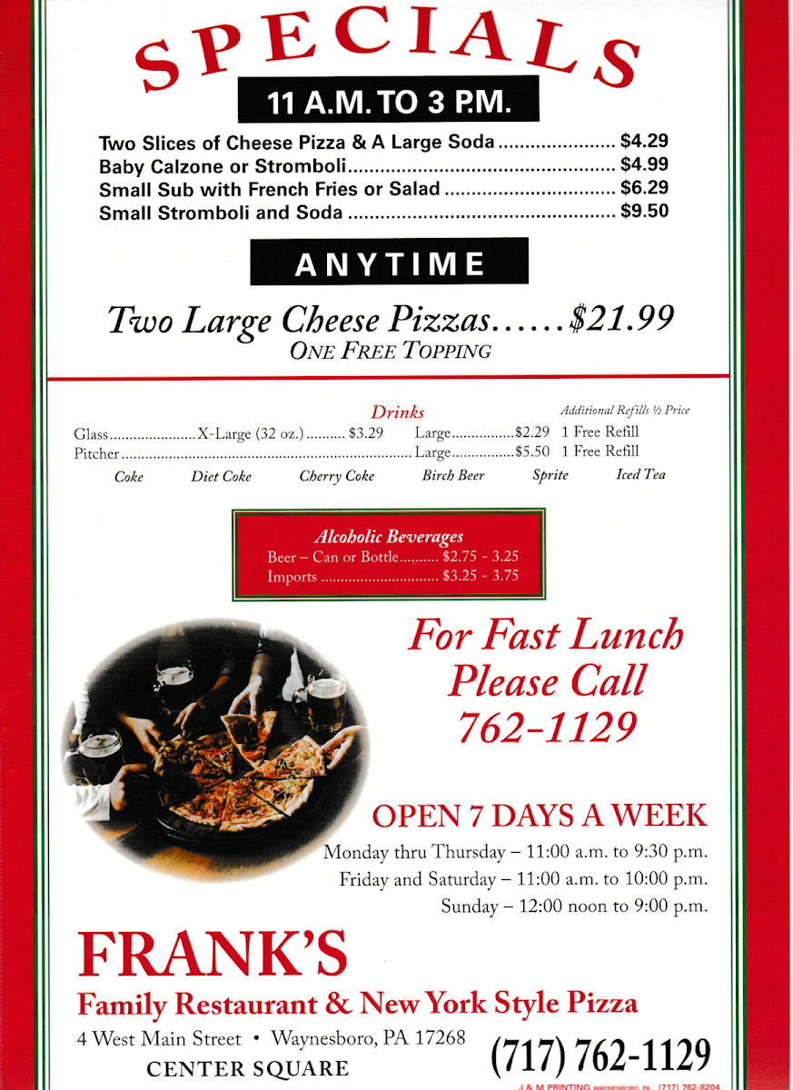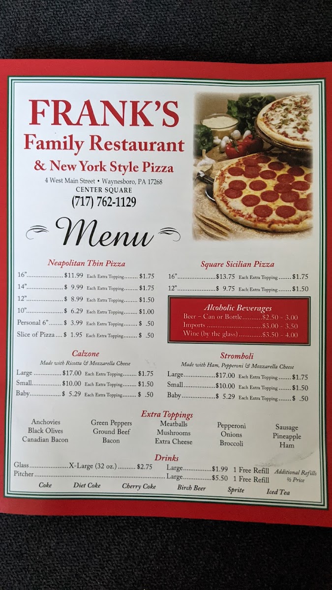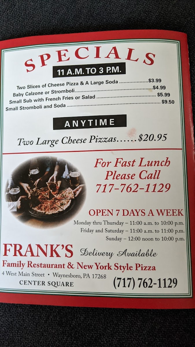 At Downtown Franks Pizza (Center Square) in Waynesboro, PA, you'll find a delightful blend of classic American breakfast and authentic New York-style pizza. The breakfast menu features indulgent options such as the Gourmet French Toast and Eggs and Such, where fluffy combinations delight with sides of yogurt or potatoes for a perfect start to the day. For lunch or dinner, their pizza steals the show with foldable slices and a crispy crust that recalls the charm of NYC.